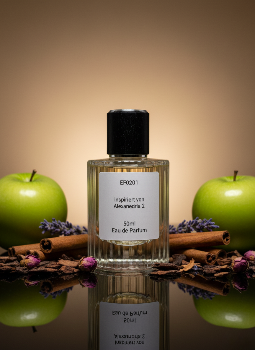 EF0201 – Inspiriert von Alexandria 2. Ein Meisterwerk der Nischenparfümerie. Dieser orientalische, holzige Duft besticht durch eine seltene Mischung aus Oud, Palisanderholz, Lavendel und Zimt. Er ist anspruchsvoll, reichhaltig und hat eine beeindruckende Sillage.