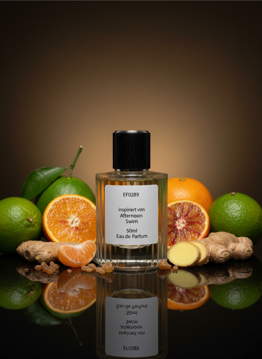 EF0289 – Inspiriert von Afternoon Swim. Ein belebender Zitruscocktail, der die reine Energie eines sonnigen Sommertages einfängt. Saftige Orangen, Bergamotte und Mandarine sorgen für ein Gefühl von sofortiger Frische und Freiheit. Ein idealer, leichter Unisex-Duft.